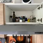 Este apartamento ofrece una cocina completa con servicio de tetera/cafetera, un hervidor eléctrico, una nevera y un horno.